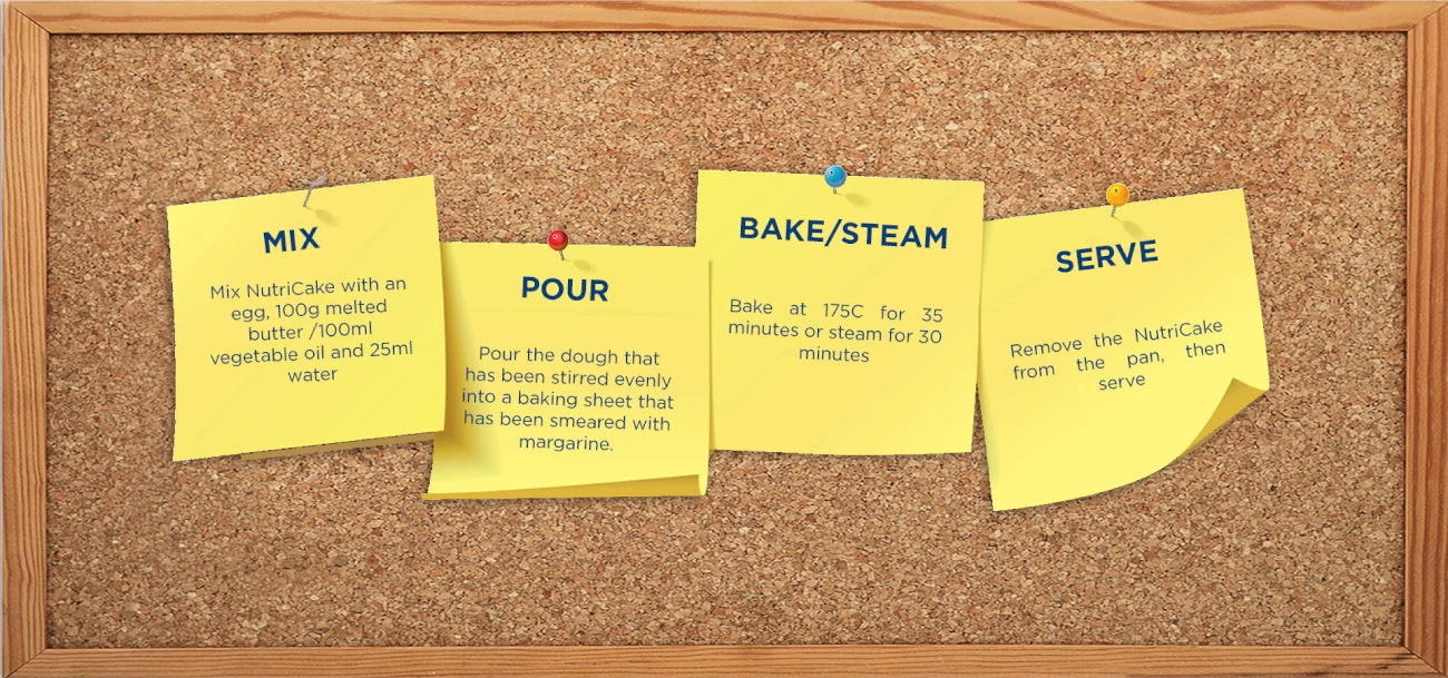 Nutricake is an instant Brownies premix, which is very easy to make even without a mixer. We can cook it by steaming or roasting. This product is really a practical solution for making your own brownies.